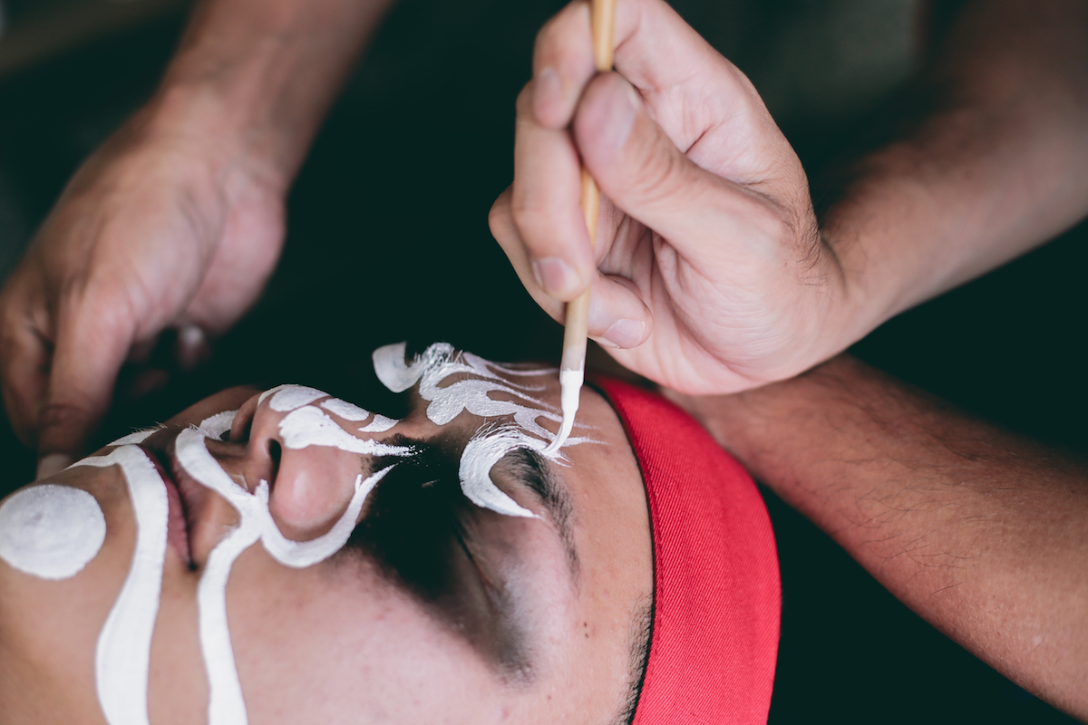 完成線條打底後,面師才能進行細節上色。面師的上色技法,延續著官將首「三點金」的上色傳統,分別會在額頭、鼻子、下巴繪製金色或黃色顏料。最後,面師會依據神將扮演者的臉型做細微的修改,直到確認神將的線條、顏色、神韻都完美時,官將首的開臉才算結束。